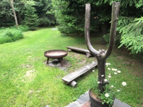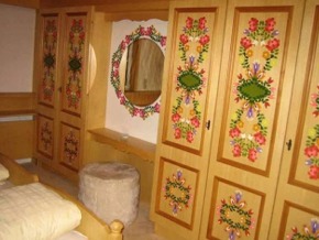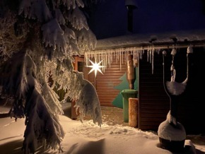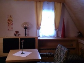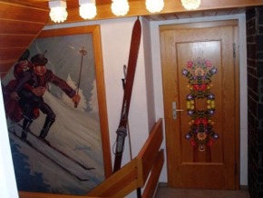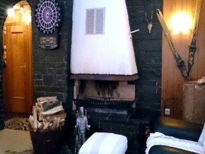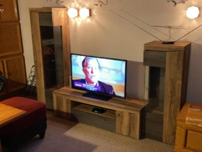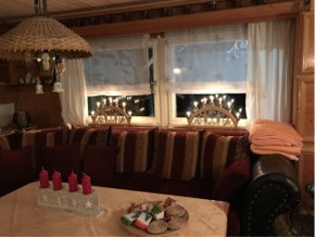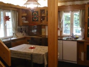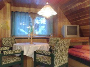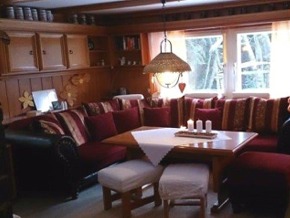 besitzt eine große Sitzecke für 8-10 Personen. Gegenüber befindet sich ein offener Kamin, welcher Romantik und Behaglichkeit schafft. Ein großer Korb Holz steht zum Heizen bereit. Ein Fernseher und eine Stereoanlage mit digitalem Satelitenempfang sorgen für zusätzliche Unterhaltung. Ein besonders schönes Stimmungsbild hat man, wenn man bei leichtem Schneefall die Fensterläden öffnet, und die Außenbeleuchtung anschaltet ......... einfach märchenhaft schön, WiFi.